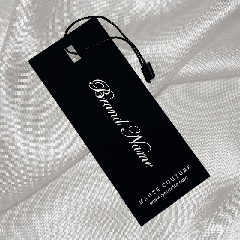 Etiqueta de cartón con sello de plástico apta para ropa y complementos de vestir, fabricada en cartón negro grueso con lámina Soft Touch y escritura plateada personalizada tipo Folio Hot Stamp. Este modelo de etiqueta está hecho de materiales de alta calidad, utilizando las tecnologías más avanzadas en el campo de la impresión digital y el acabado.