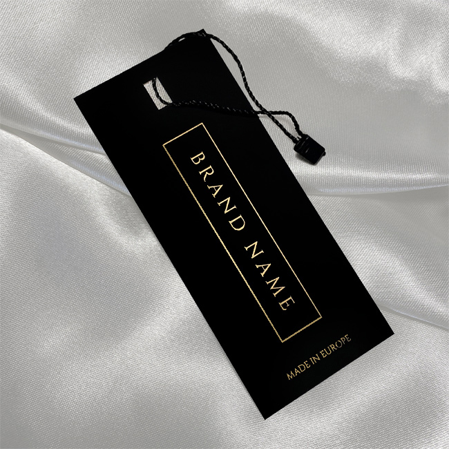 Etiqueta de cartón con escritura dorada y fondo negro, provista de cordón para prendas de vestir, fabricada en cartón grueso laminado Soft Touch por ambas caras. Este modelo de etiqueta está hecho de materiales de alta calidad, utilizando las tecnologías más avanzadas en el campo de la impresión digital y el acabado.