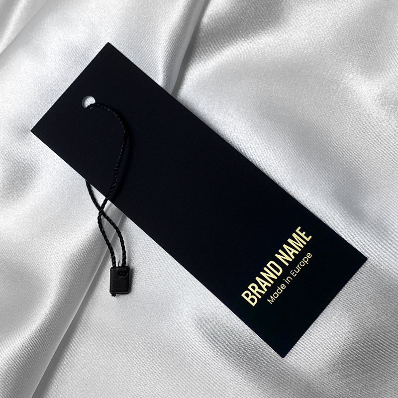 Etiqueta para ropa o complementos de vestir, realizada bajo pedido en cartulina Soft Touch negra, personalizada con lámina plateada con el nombre de la marca o logo. Este modelo de etiqueta está hecho de materiales de alta calidad, utilizando las tecnologías más avanzadas en el campo de la impresión digital y el acabado.