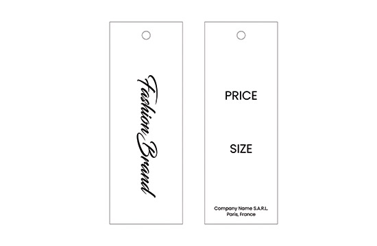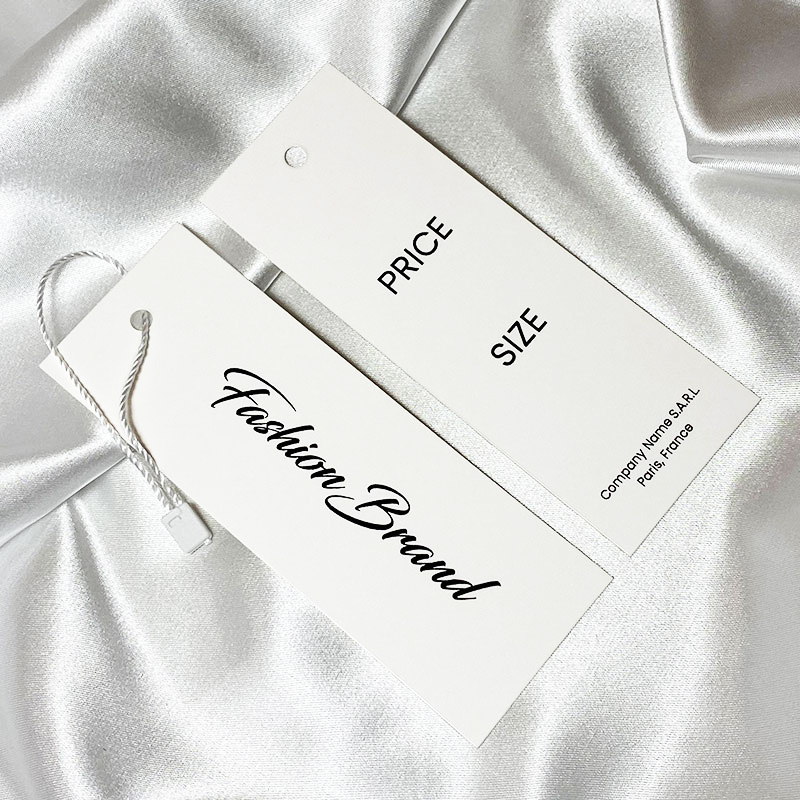 Etiqueta de producto fabricada en cartón, provista de cordón blanco para colgar en la ropa, personalizada con texto y logo del fabricante en ambas caras. Este modelo de etiqueta está hecho de materiales de alta calidad, utilizando las tecnologías más avanzadas en el campo de la impresión digital y el acabado.