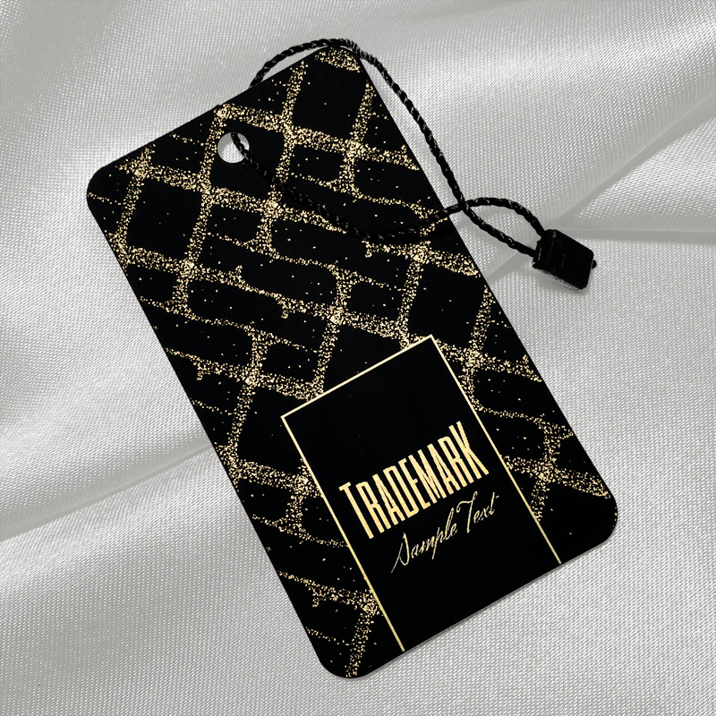Etiqueta de escritura dorada fabricada en cartón laminado con una lámina especial con textura de terciopelo, adecuada para ropa, complementos de vestir, zapatos y otros. Este modelo de etiqueta está hecho de materiales de alta calidad, utilizando las tecnologías más avanzadas en el campo de la impresión digital y el acabado.