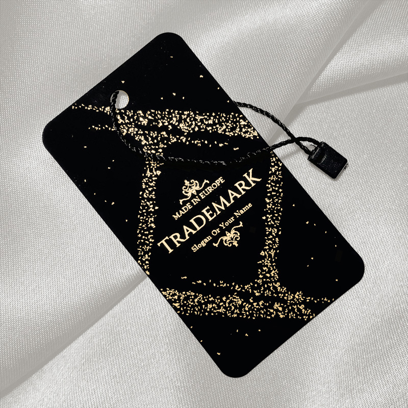 Etiqueta de cartón con sello para ropa o prendas diversas, modelo HT-M97, fabricada en cartón plastificado con lámina especial, con efecto terciopelo y escritura dorada. Este modelo de etiqueta está hecho de materiales de alta calidad, utilizando las tecnologías más avanzadas en el campo de la impresión digital y el acabado.