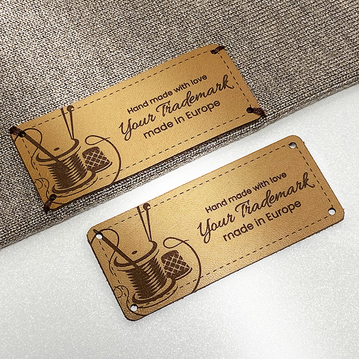 Etiqueta de cuero natural EP-M64 para ropa, personalizada con el nombre o logo del fabricante mediante grabado láser. Este modelo de etiqueta de cuero está fabricado en cuero natural de calidad superior, utilizando equipos de última generación y métodos profesionales de grabado o repujado láser.