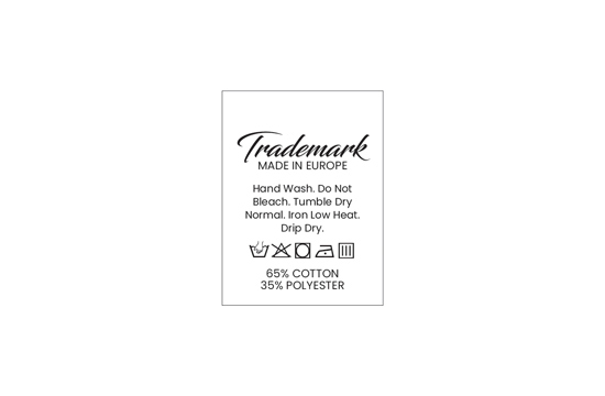 Etiqueta textil con instrucciones de lavado y detalles sobre la composición del material, de fino satén blanco, personalizada con el nombre de la marca y otros datos. Este modelo de etiqueta textil se fabrica utilizando las tecnologías más avanzadas en el campo de la impresión digital en medios textiles. Las etiquetas están impresas en satén especial, por el método de transferencia térmica, con una calidad de impresión impresionante y alta resistencia al lavado.
