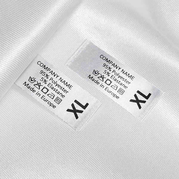 Etiqueta de composición con tallas y símbolos de lavado fabricada en raso de alta calidad, para coser en ropa. Este modelo de etiqueta textil se fabrica utilizando las tecnologías más avanzadas en el campo de la impresión digital en medios textiles. Las etiquetas están impresas en satén especial, por el método de transferencia térmica, con una calidad de impresión impresionante y alta resistencia al lavado.