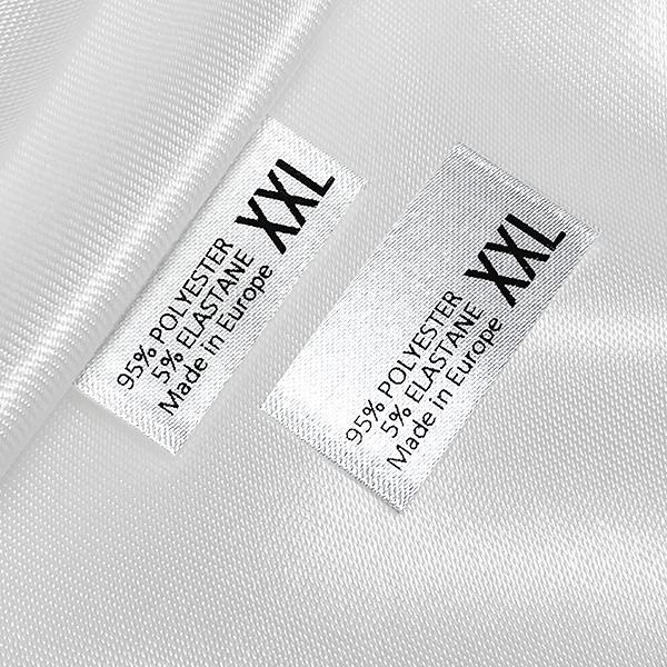 Etiqueta de composición con talla personalizada a pedido con los datos del fabricante y el tipo de material, para coser en ropa o prendas diversas. Este modelo de etiqueta textil se fabrica utilizando las tecnologías más avanzadas en el campo de la impresión digital en medios textiles. Las etiquetas están impresas en satén especial, por el método de transferencia térmica, con una calidad de impresión impresionante y alta resistencia al lavado.