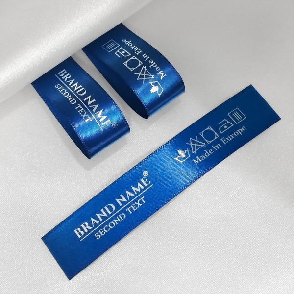 Etiqueta de composición personalizada con signos de lavado y mantenimiento, y la Marca o logo, adecuada para cualquier producto textil, especialmente prendas de vestir. Este modelo de etiqueta textil se fabrica utilizando las tecnologías más avanzadas en el campo de la impresión digital en medios textiles. Las etiquetas están impresas en satén especial, por el método de transferencia térmica, con una calidad de impresión impresionante y alta resistencia al lavado.