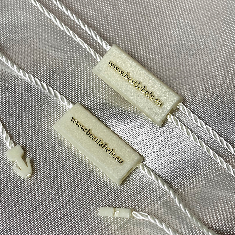 - Materiales: plástico (sello) y poliéster (cordón).
