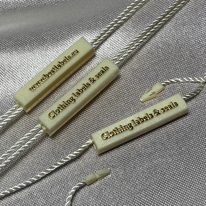- Materiales: plástico (sello) y poliéster (cordón).