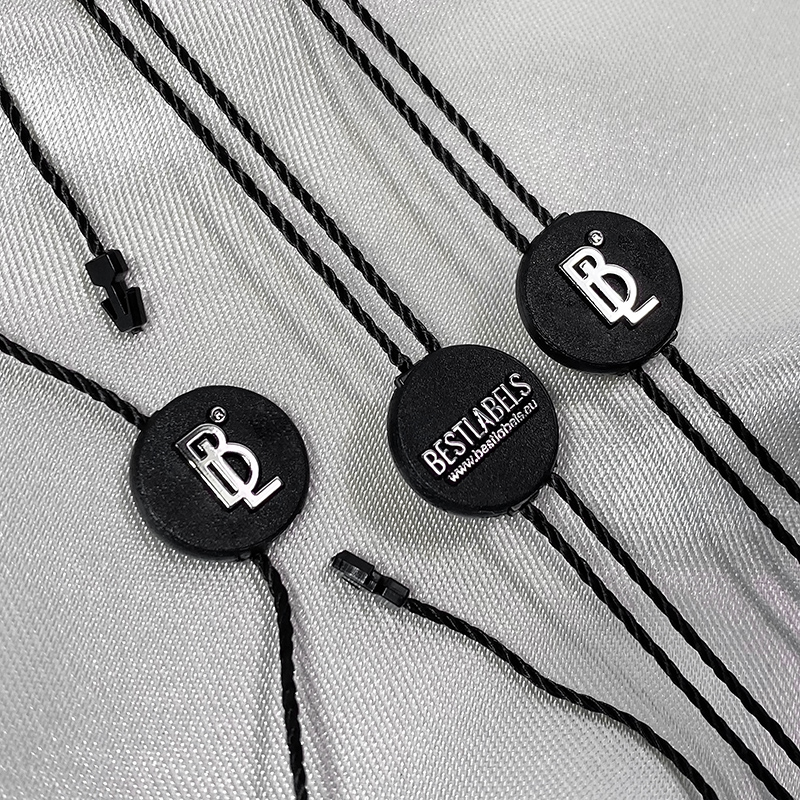 - Materiales: plástico (sello) y poliéster (cordón).