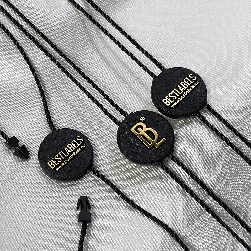 - Materiales: plástico (sello) y poliéster (cordón).